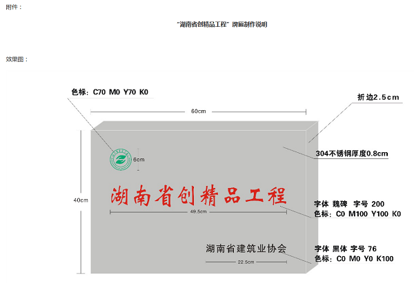 二、施工单位根据“湖南省创精品工程”牌匾制作说明(详附件)自行制作,并将牌匾悬挂于施工现场“五牌一图”处。