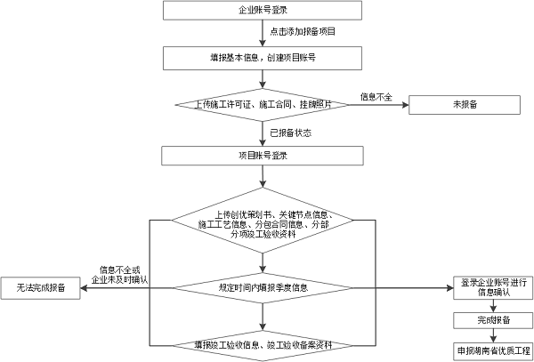 1、企业须在施工许可证/开工报告下发15日内填报基本信息、创建项目账号、上传“湖南省创精品工程”挂牌照片进行报备。