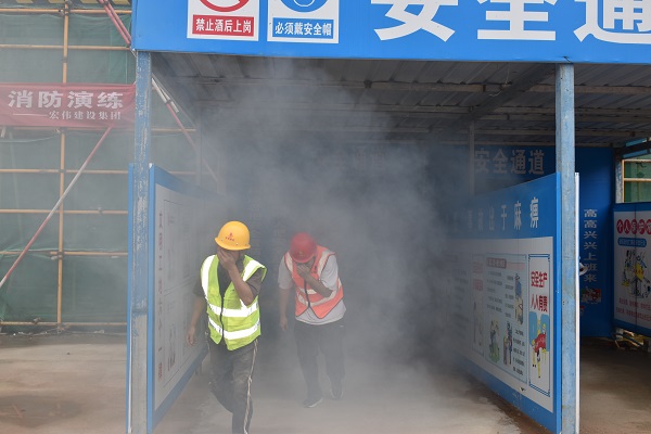工地模拟火灾现场,突然浓烟滚滚,应急救援抢险队迅速响应,指挥员下达命令:启动灭火应急预案,并拨打“119”报告消防队。疏散引导组迅速切断电源,指挥被疏散人员通过消防通道迅速撤离火场,在撤离过程中被疏散人员弯腰低头用手或湿毛巾捂住鼻子和嘴进行简单自救,在引导员的指挥下撤离到安全区。灭火组查找起火点,利用风力灭火机、干粉灭火器、消防栓水龙带对火势进行压制,当大火扑灭后,灭火组清查现场情况,防止余火复燃。