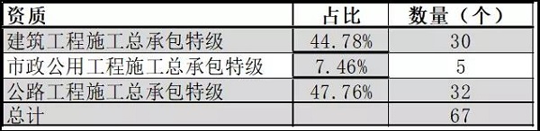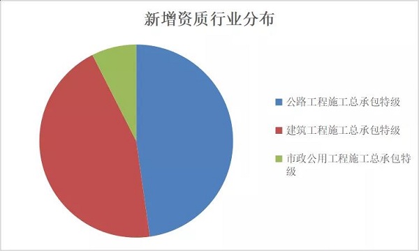 从新增特级资质的行业分布上来看,去年初至今,建筑企业特级资质仅有建筑工程、公路工程、市政工程新增,分别为30个、5个和32个,其它行业并无新增。