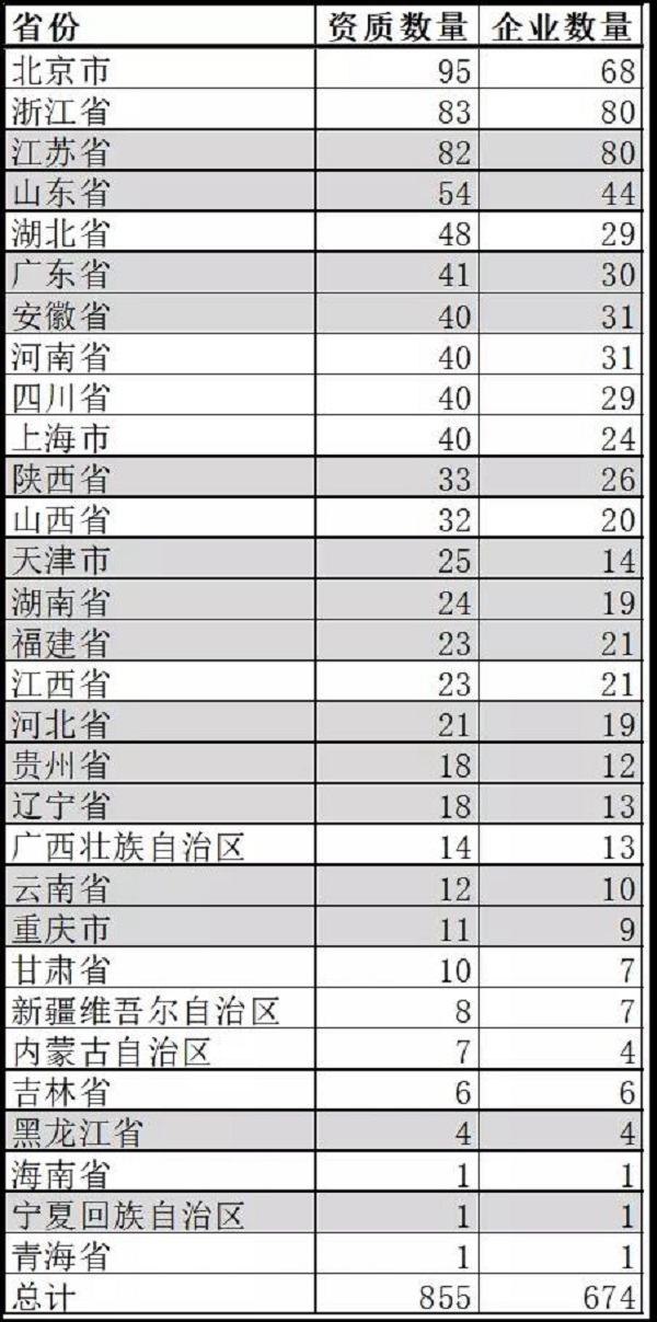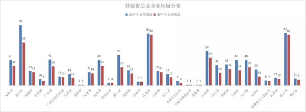 从特级资质的地域分布上来看,北京、浙江和江苏依然是前三名,228家企业共拥有260个特级资质。其中,北京特级资质数量最多,达95个;浙江和江苏特级资质企业数量最多,皆为80个。