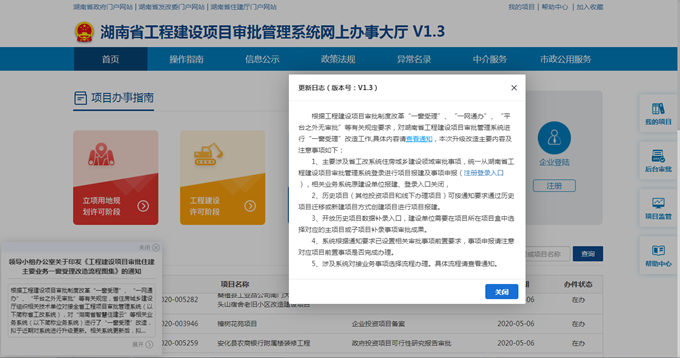 2020年5月6日,湖南省工程建设项目审批管理系统、湖南省工程项目动态监管平台、湖南省施工图管理系统、长沙市工程建设项目审批管理系统等相关业务系统集中更新升级,在相关业务系统全流程网上办理、无纸化办理的基础上,实现了工程建设项目审批环节中全省住建有关业务的深度融合,实现“一窗受理、一网通办”。